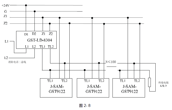 制器總線上,同時將報警按鈕的TL1、TL2 端子與GST-LD-8304 消防電話模塊連接,具體見圖2- 8