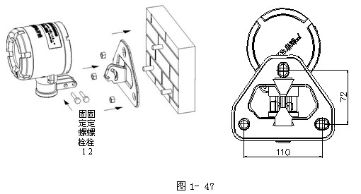 探 測器的安裝方式有兩種,一種是安裝在墻壁上,另一種是安裝在頂棚上。探測器附件備有卡箍和壁板,用于探測器的安裝,卡箍和壁板結構示意圖如圖1-47所 示。壁板用三個M660的膨脹螺栓直接固定在墻壁或者頂棚上,卡箍用來連接探測器和壁板。通過調(diào)節(jié)探測器和卡箍,可以使探測器向上轉動18°,向下轉動 50°,左右轉動各90°。安裝時,先把卡箍套在探測器的支撐軸上,然后通過固定螺栓1將卡箍連接到壁板上,接好探測器連接線。調(diào)節(jié)探測器和卡箍,使探測 器正對被保護區(qū)域,然后擰緊固定螺栓1和固定螺栓2,將探測器固定好。