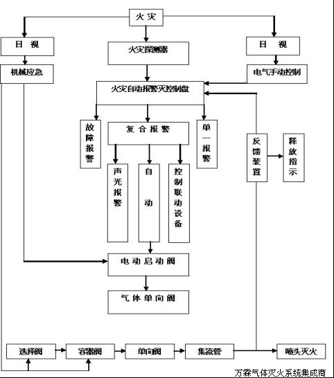 將滅火控制箱的控制方式選擇健放到“自動(dòng)”位置。保護(hù)區(qū)有火災(zāi)發(fā)生,火災(zāi)控制器接收到火情信息并甄別后由報(bào)警和滅火控制系統(tǒng)發(fā)出聲光報(bào)警及下達(dá)滅火指令。并按下列程序工作:完成“聯(lián)動(dòng)設(shè)備”的啟動(dòng)(如停電、停止通風(fēng)及關(guān)閉門窗等。本系統(tǒng)只提供消防聯(lián)動(dòng)模塊用于切斷電源,但設(shè)備聯(lián)動(dòng)的具體實(shí)施工作及工程報(bào)價(jià)本系統(tǒng)的工程報(bào)價(jià)不含),延遲0-30秒通電打開電磁啟動(dòng)器;繼而打開氮?dú)猓∟2)啟動(dòng)瓶瓶頭閥→分區(qū)釋放閥→七氟丙烷儲瓶瓶頭閥→釋放七氟丙烷氣體實(shí)施滅火。