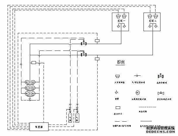 七氟丙烷自動滅火裝置原理圖參見下圖。根據規范要求及用戶的具體情況可以采用全淹沒的單元獨立系統和組合分配系統兩種組成方式。所謂單元獨立系統是指由一 套滅火劑儲存裝置對應一套管網系統,保護一個防護區域的構成形式。所謂組合分配系統是指由一套公共的滅火劑儲存裝置對應幾套管網系統,保護兩個或兩個以上 防護區域的構成形式。